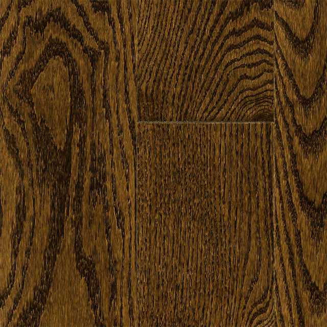 Mocha oak hardwood flooring's rich dark brown tones provide a luxury look. Every 5-inch-wide plank displays the unique pattern and grain variations in the wood. The smooth texturing gives a sleek appearance that allows the wood's natural beauty to show through. These planks have a classic appeal, making them an excellent long-term investment for your home.