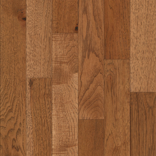 Our Saddle Hickory solid hardwood flooring showcases a rich, warm amber-brown tone that radiates rustic elegance throughout any space. This floor features distinctive grain patterns with natural variations, knots, and mineral streaks that highlight hickory's renowned character and natural beauty, resulting in planks that create a timeless, classic appeal while -- with subtle textures revealing authentic character that catches light beautifully. Crafted from one of America's most durable domestic hardwoods, Saddle Hickory offers exceptional robustness and excellent stability that make it a perfect fit for living spaces and bedrooms and it can be refinished multiple times over its lifespan, allowing you to renew its luster for generations.