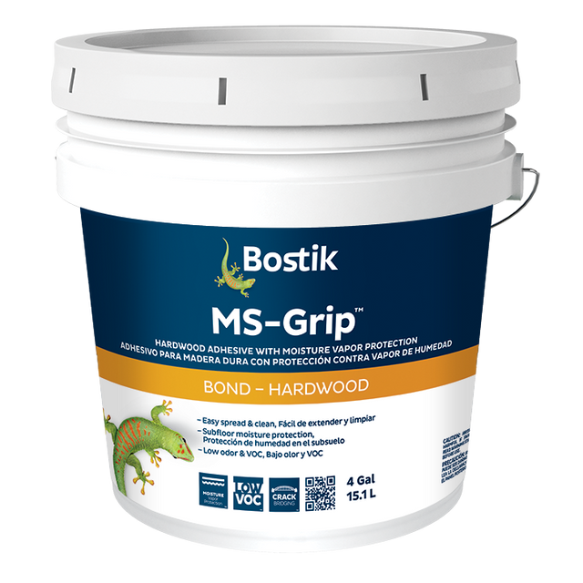 Bostik MS GripTM is a hardwood and bamboo adhesive and moisture control membrane all in one. This adhesive formulation maintains long term durability and moisture control properties, and it is easy to spread and clean off of prefinished flooring before and after cure. This adhesive has low VOC's (as measured per EPA Method wr) and does NOT contain any water.