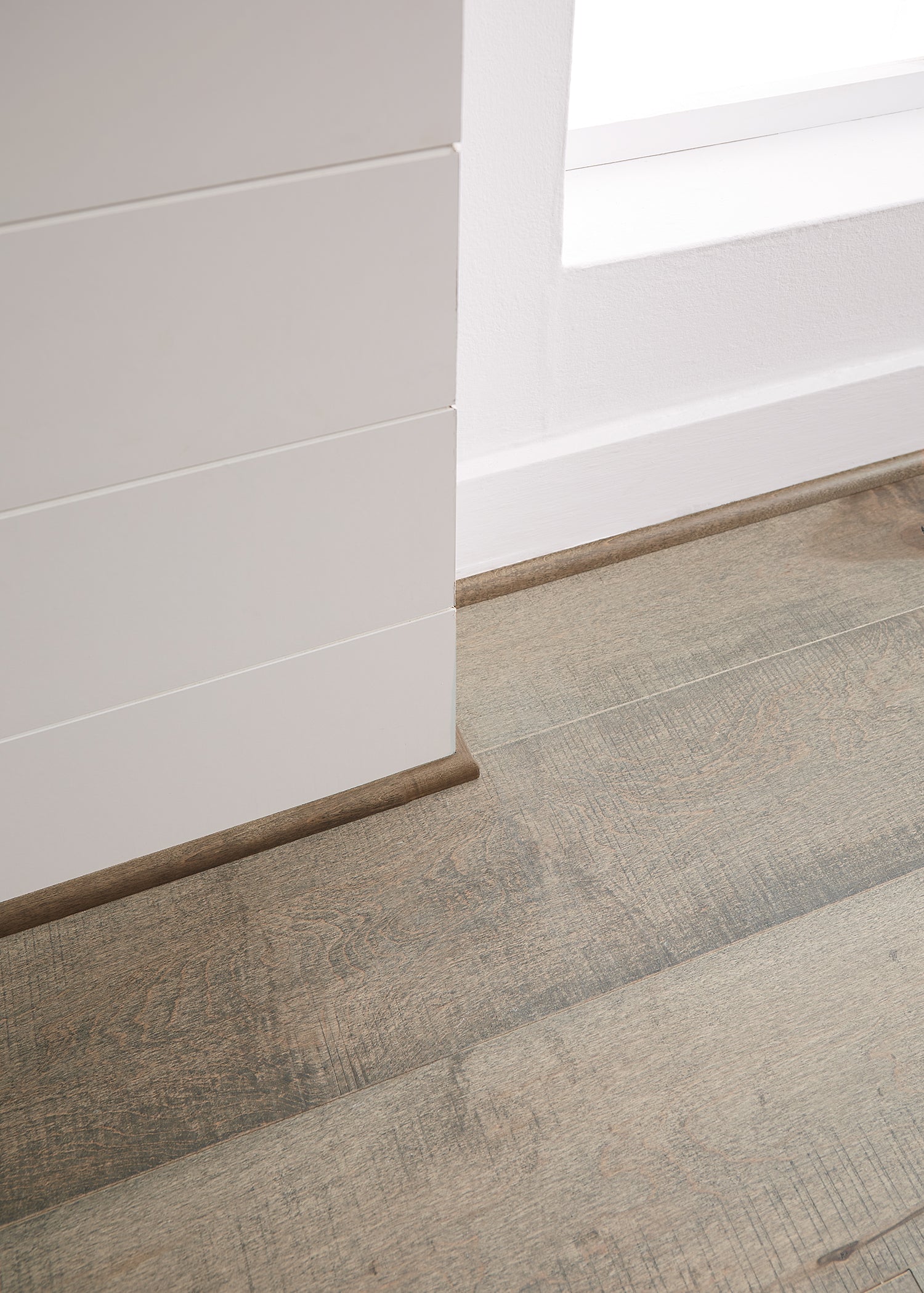 Transitions between a wood floor and a vertical surface under cabinetry. Also serves as a substitute for Quarter Round when space is limited