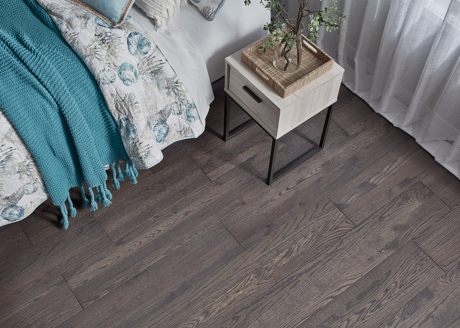 Bellawood Artisan's West Hampton Oak is finished with Bellawood's premium finish, with stylish tones blending warmer brown shades with hints of neutral slate gray creating a unique, designer style while maintaining the wood's classic natural apeal. Flowing grain details reveal the timber's beauty at a closer look. The boards are crafted to stunning dimensions over eight inches in width. This floor uses premium Red Oak of 'Natural Grade,' maintaining the appearances you would expect from a hardwood floor, such as knots, shallow-back, and small splits that create its desireable natural personality. This also results in varying board lengths, further capturing the rustic style. Wire brushing of the surface removes the softer top grain features, showcasing the robust details of the more durable heartwood, which gives the luxurious look and feel of re-claimed wood that has weathered the tests of time.