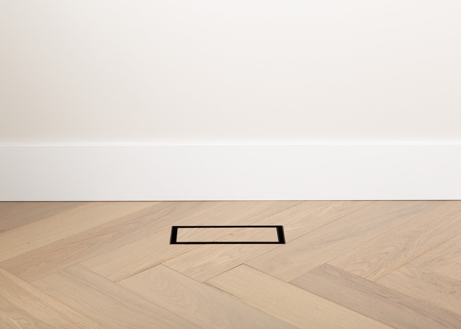 The ultra-minimal, frameless floor vent. Flush with no rim - only a single rectangular air channel is visible. This model must be mounted prior to surface material. Install best done by a PRO.