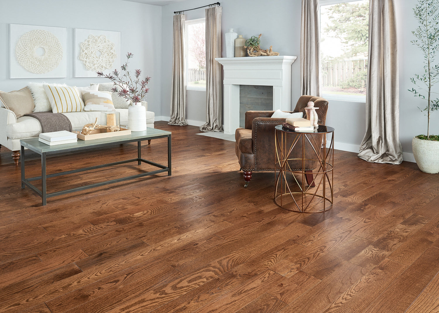 These solid hardwood red oak floors offer a timelessly captivating aesthetic. Each plank displays a unique grain in varying shades of rich brown. While their darker tone suits a classic appeal, their 5–inch width gives them a fresh edge. Wider planks are a trend–forward style that makes these floors the perfect balance of sophisticated and modern.